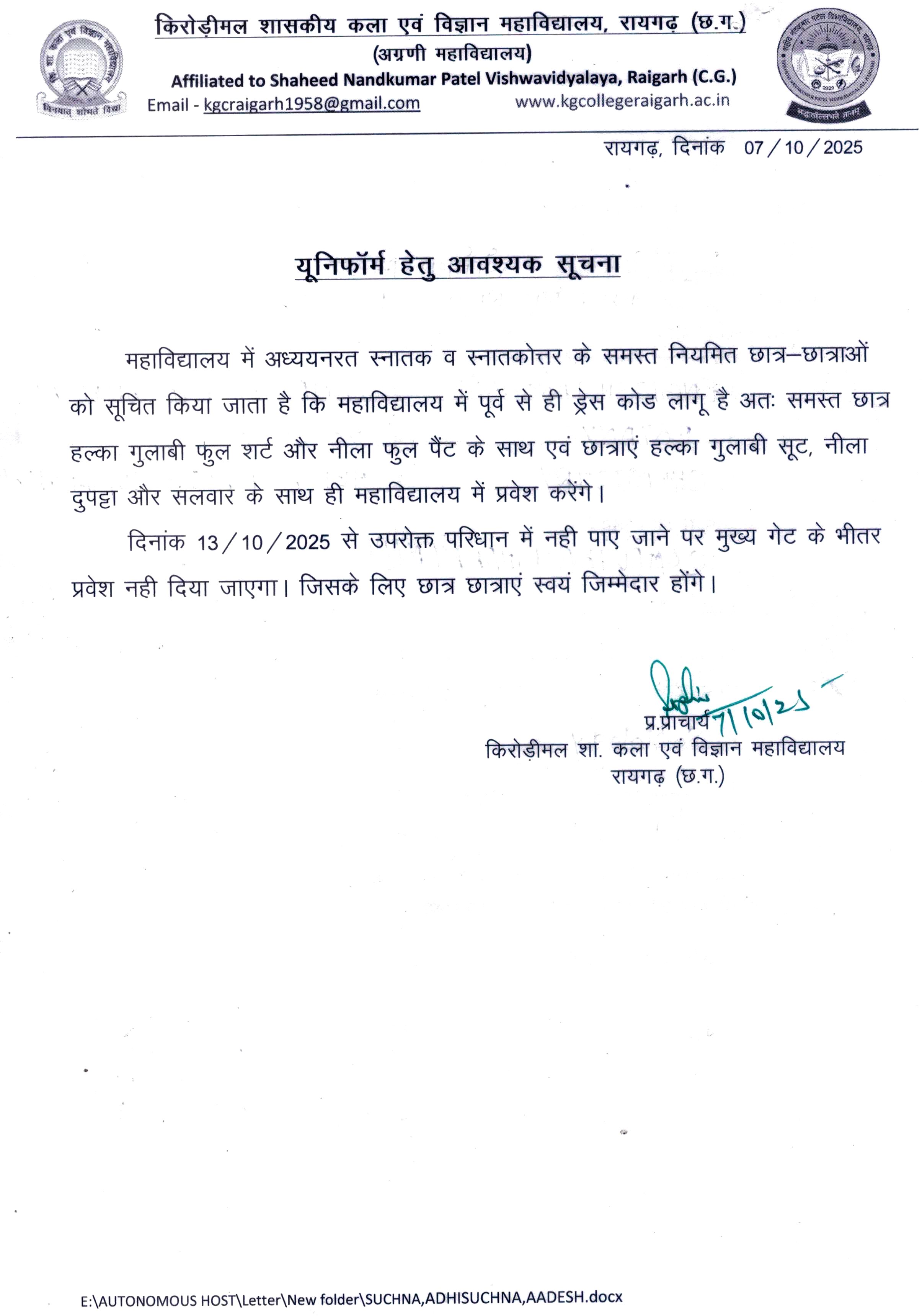 Visit of Group Commander Raipur NCC for Internal Audit of NCC